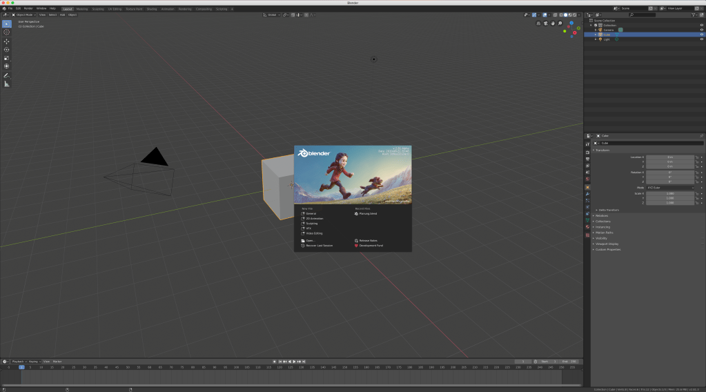 Wird Blender gestartet, findet sich in der Mitte ein Kasten mit Versionsbild sowie Versionsnummer oben rechts in der Ecke. Darunter werden zuletzt genutzte Projekte angezeigt, die sich durch einen beherzten Klick starten lassen. Nach einem Absturz lässt sich auch oft das letzte Projekt wiederherstellen durch einen Klick auf „Recover Last Session“.