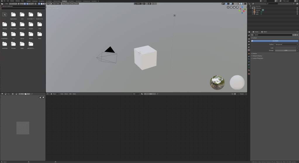 Dieses UI Layout ist, wie der Name schon sagt, auf das Modellieren von 3D Objekten Spezialisiert. So verschwindet die für das Modellieren unwichtige Timeline und der 3D Viewport ist in den „Edit Mode“ geschaltet. Noch klarer wird das Konzept der Reiter, wenn wir auf den Reiter „Shading“ klicken.