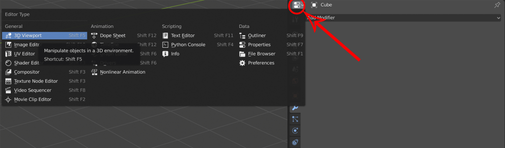 Gerade in den ersten Stunden werden wir uns hauptsächlich in den UI Presets „Layout“ und „Modelling“ aufhalten. Wichtig ist nur, dass alle Reiter der gleichen Logik zugrunde liegen: Wir haben Blöcke, in denen wir die Fenster öffnen können, die uns belieben. Wenn wir eine Funktion kennenlernen, werden wir uns ab sofort zunächst die dafür benötigten Fenster anschauen.