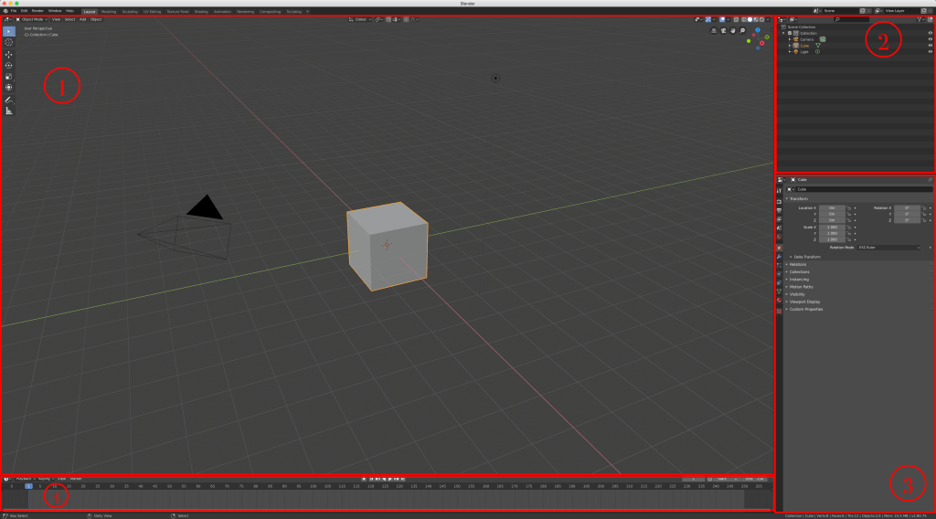 Nr. 1 ist der „3D Viewport“. Es ist das größte und auch das Hauptwerkzeug in Blender. Hier hat man den Überblick über die geschaffene 3D Szenerie, beim Modellieren, beim Animieren sowie beim Kameraeinstellungen finden.