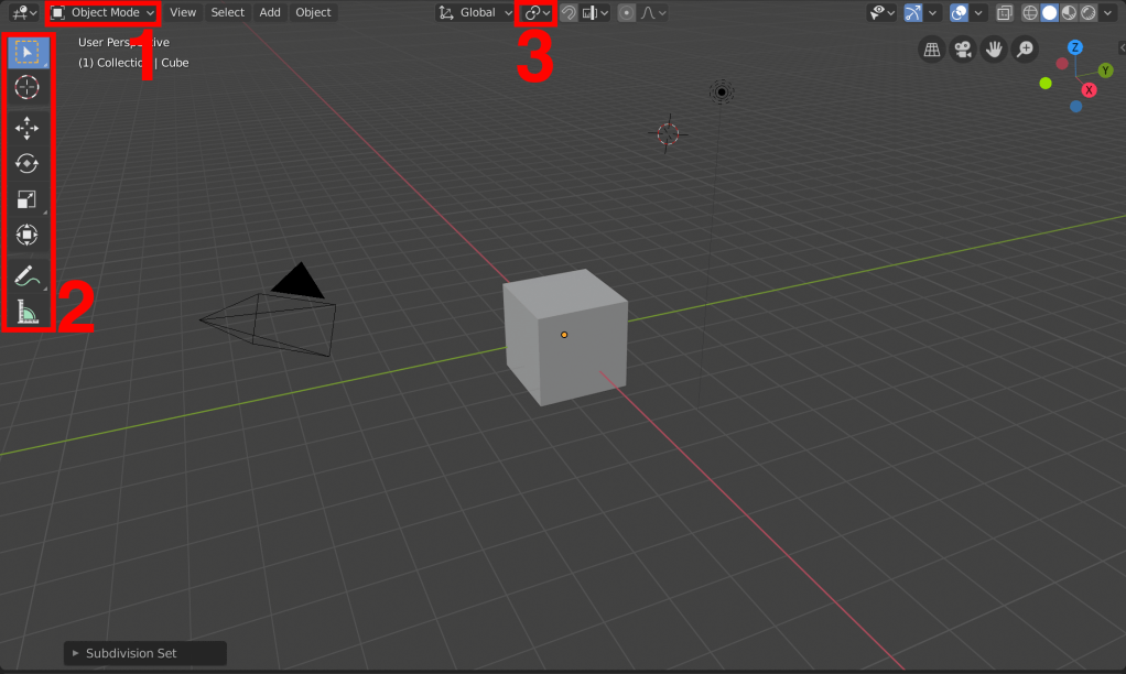 - Der 3D Viewport kann in mehrere Modi geschaltet werden. Standartmäßig ist dieser in den „Object Mode“ geschaltet. Er ist dafür gedacht, ganze Objekte im Raum zu Platzieren und zu bearbeiten. Die dafür vorgesehenen Werkzeuge finden sich in einer Leiste schräg links darunter (2).