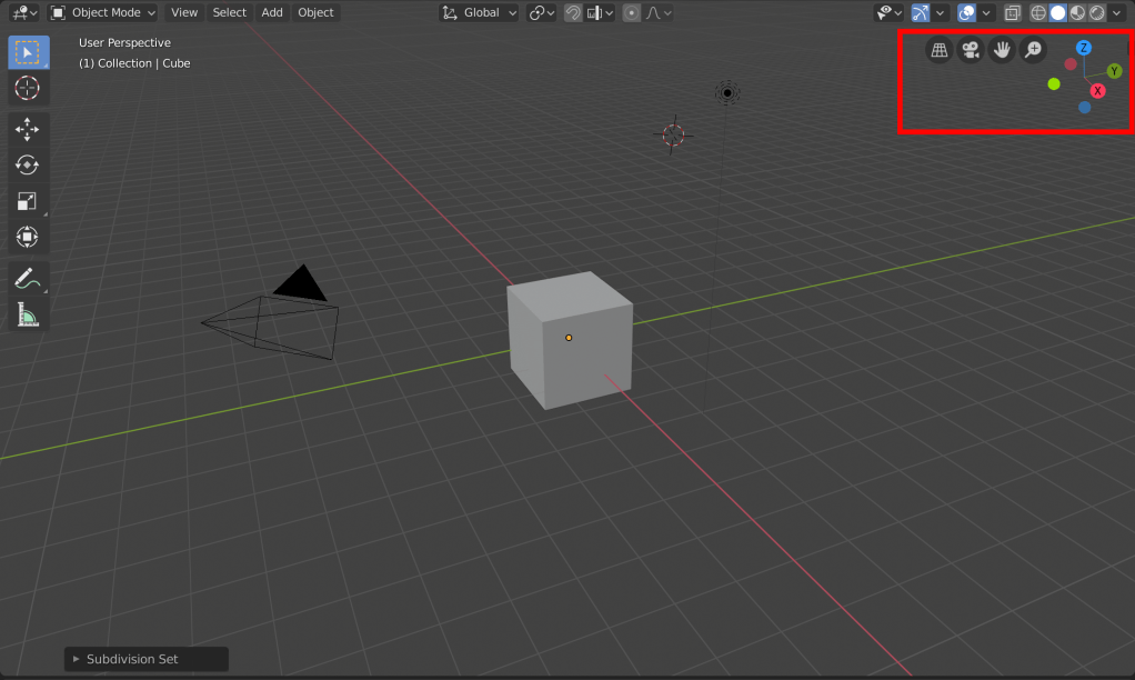Auf der rechten Seite sehen wir ein Koordinatenkreuz. Durch das simple Anklicken einer Achse mit Links, oder dem geklickt lassen und Ziehen der Maus können wir unsere Perspektive ändern. Neben dem Kreuz befindet sich eine Vergrößerungslupe. Durch das Klicken und Ziehen der Maus (auch hier geklickt lassen), lässt sich die Vergrößerung einstellen. Durch ein Ähnliches Spiel mit der Hand links daneben lässt sich das Zentrum der Perspektive verändern. Durch einen Klick auf die Kamera springen wir in das Sichtfeld unserer Kamera, durch die am Ende auch gerendert wird. Links daneben lässt sich die Sichtart von perspektivisch zu orthogonal umschalten.